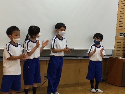 「♪わくわくキッチン」の「じゅうじゅうじゅう・」や「こねこねぽん・」をヒントに、言葉とリズム打ちを合わせた活動を進めています。少し難しい学習ですが、2回目の今日は、チーム毎に発表する時間がもてました。