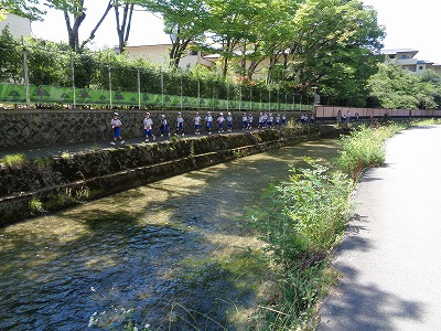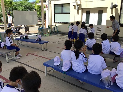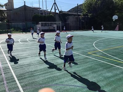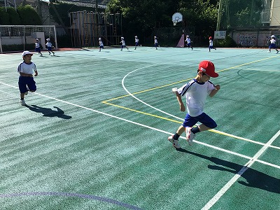 そして、今日は暑さと校外学習に備えて、小学校運動場を1~2周走りました。