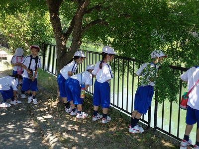 れんげウキウキ遠足のみんなのアイドル、カメさん。前回はたくさん「ひなたぼっこ」していましたが、今回は暑すぎて水の中にいる様子。「その気持ち、よく、分かるよ!」