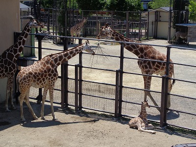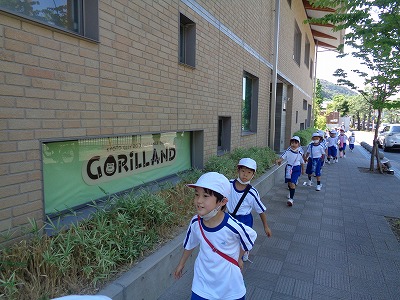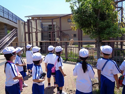 キリンさん前。キリンの子どもが1年生を見て、突然ぐるぐると走り始めました。まるで歓迎してくれているかのよう!