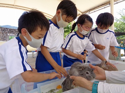 講師の先生より、ウサギの足がふわふわであることを聞きました。その理由を考えた後、教えてもらいました。冷たいところや岩場でも、ふわふわの毛が守ってくれるのですね。かわいい肉球もあります。