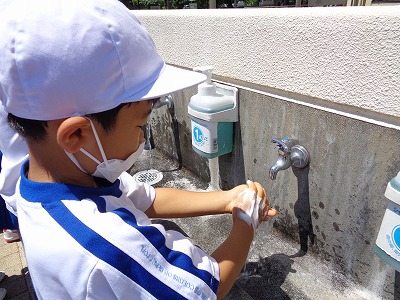 なかよし教室を出ると、すぐに石けんで手を洗います。常に水分補給もしています。