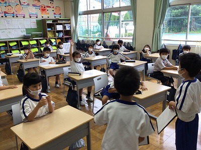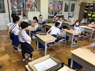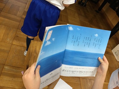 「聖歌」や「校歌」「七夕さま」を歌唱した後に、季節の歌「♪うみ」を学習しました。「♪うみはひろいな おおきいな・・・」のなつかしい歌です。