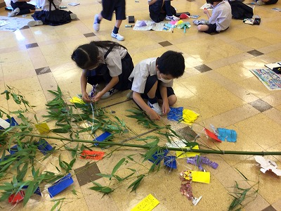 今日は、2年生と短冊に願い事を書き、七夕飾りを作って笹にかざりました。