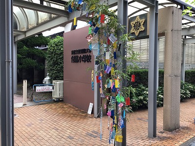 七夕の笹は、今週末まで小学校玄関先に飾っています。