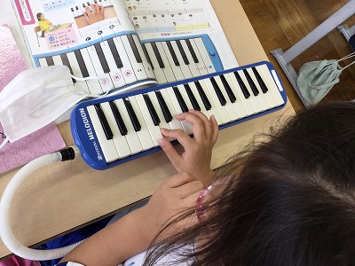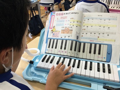 教室では、「♪あのね」の歌に出てくる「ドレミ」を鍵ハモで演奏する活動を行いました。