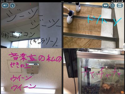 水槽から聞こえる音や、音楽室のスクリーンカメラのファンの音など、耳を澄ませて感じた身の回りの音にも触れることができました。