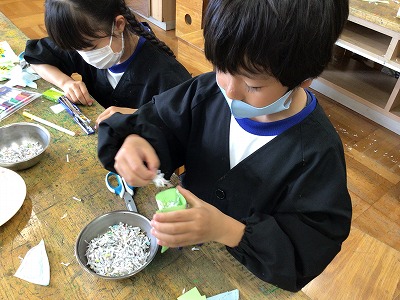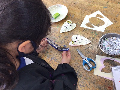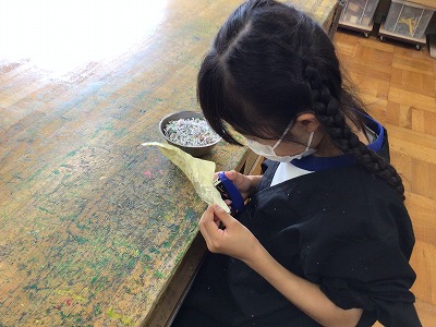 そうしてつくった袋にシュレッダーで細かく切った紙を入れて、ステープラーで閉じたら、むにゅっち達の元が完成です!