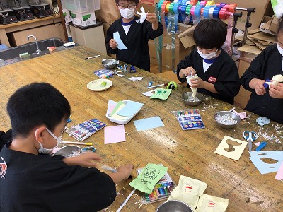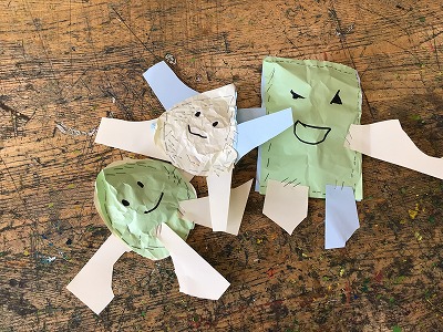 そこから、顔を描いたり、手足を付けたり、楽しい形に切ったり、、、子どもたちの発想の力で、かわいい作品がたくさんできました。