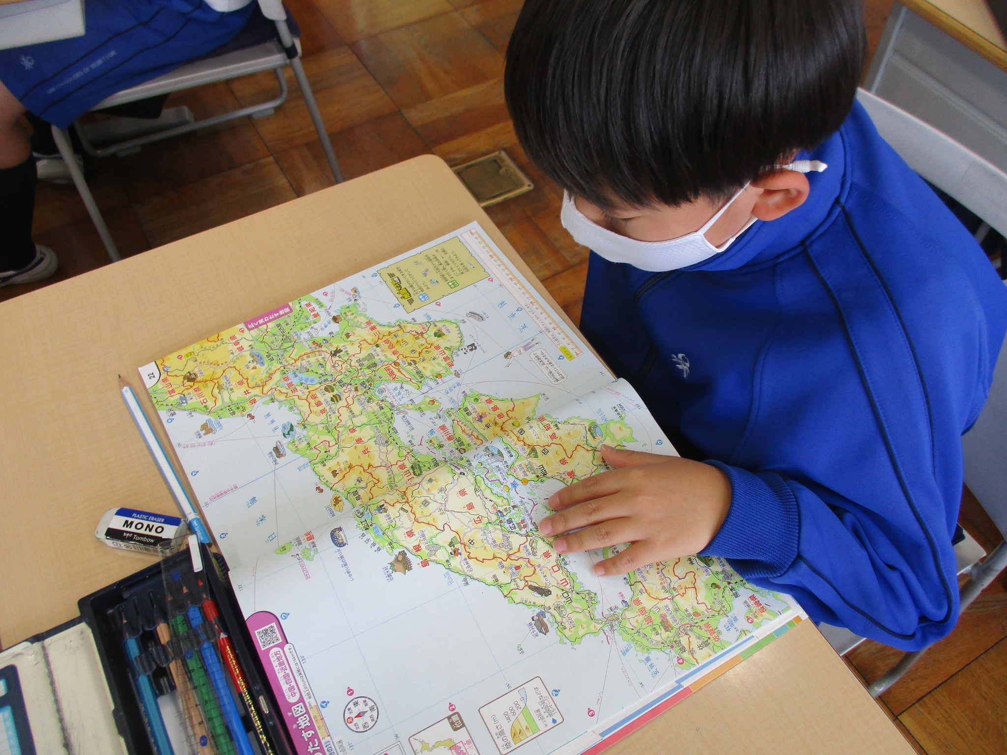 地図帳を使って、方位や地図記号、地図の距離の学習を行いました。