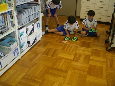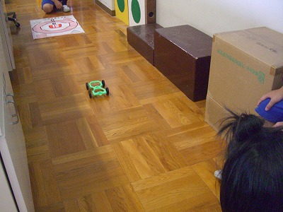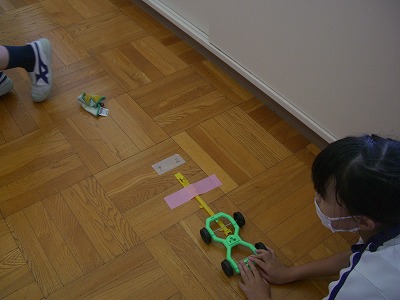 はじめに、まと当てをして、車を走らせる練習と「ゴムを引く力」の確認です。