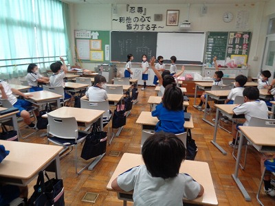 登校時、雨が降っていなくても雨具の準備を忘れないように全体で確認しました。また、校内での過ごし方にも声かけしました。
