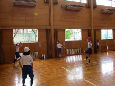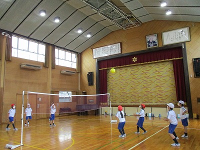 暑さ対策のため、体育館でソフトバレーボールに取り組みました。