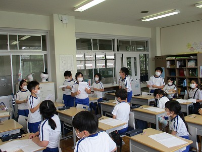 国語の教科書に載っている「カンジー博士の都道府県の旅2」を見て、それぞれが考えたクイズを出しています。