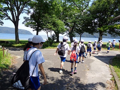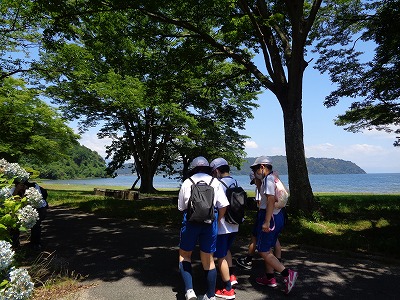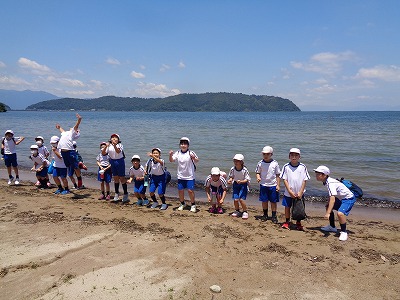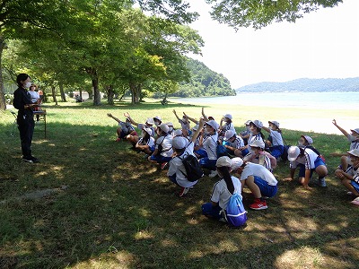 浜辺で少し散策。湖水と島に感激の様子。「みんなで大ジャ~ンプ!」