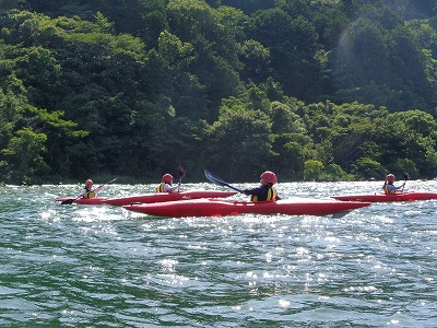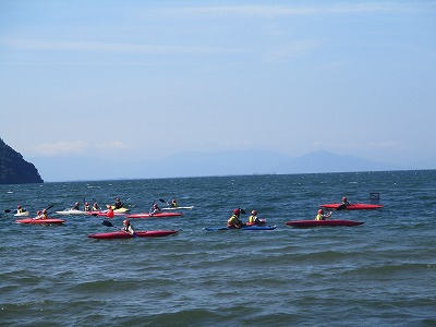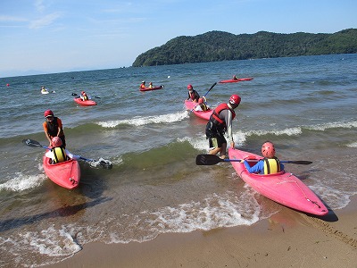 一列に並びます。実は風があり、波が立っていました。浜辺を出発しても、しっかりとパドルを動かさないと浜辺に戻されてしまいそうです。