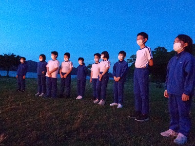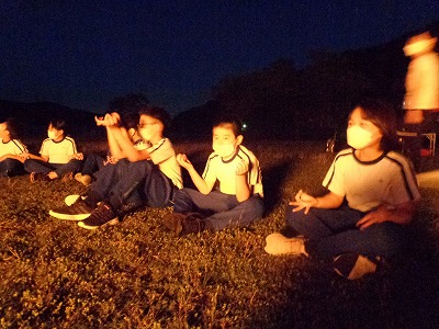 その後は、辺りはすっかり真っ暗になりました。キャンプファイヤーを終え、校長先生の星空観察が始まりました。今日は7月7日の七夕。校長先生の「七夕記念日、本物プラネタリウム」を楽しませてもらいました。織姫と彦星をきちんと確認できました!