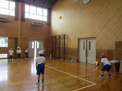 熱中症対策のため運動場ではなく、今日も体育館で行いました。