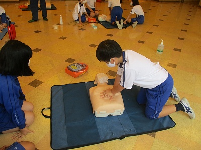 京都市の消防局から来ていただいた3名のゲストティーチャーに、胸骨圧迫とAEDの使い方について教わりました。