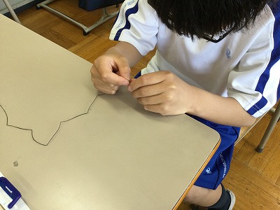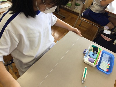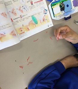 縫い糸の色を自分で決め、机の横の長さくらいに切ります。さっそく覚えたての“糸切りばさみ”が役に立ちます。