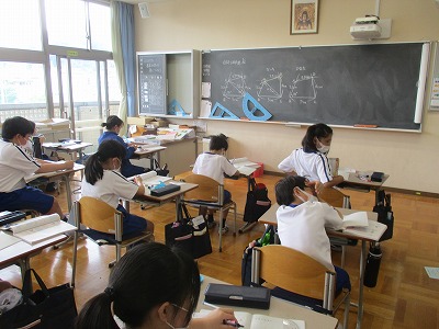 算数では、先日学習した「合同な三角形」のかき方を使って、今日は「合同な四角形」の作図に取り組みました。