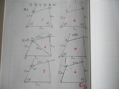 自分のかき方で四角形をかいた後に、みんなで一斉に5通りのかき方で合同な四角形をかいていきました。 コンパス、分度器、三角定規をうまく使って、5つ以上の合同な四角形をノートにかき上げることができました。