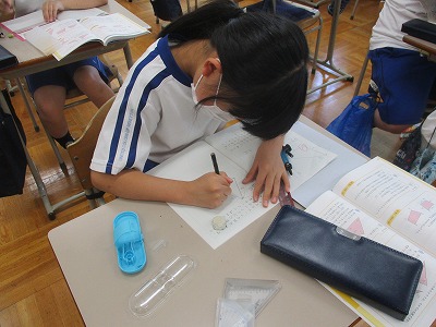5年教室の習熟クラスは、合同な図形・作図の復習です。教科書の「もっと練習!」の問題に取り組んで、三角形の合同な図形のかき方に再チャレンジ。