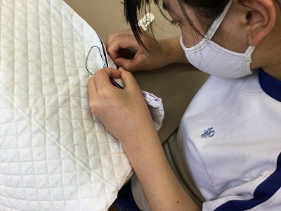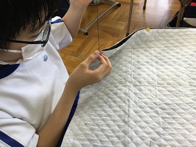 縫い始めると、みんな黙々と作業に取り組んでいます。“玉どめ”をしたいのに、すっかり糸が短くなってしまったときの対処法も、少しずつ浸透してきました。
