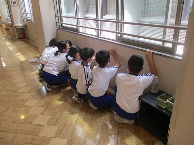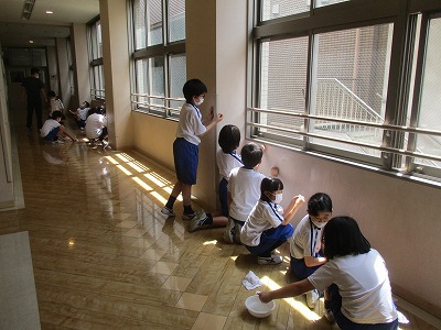 中間、昼休みには、クリーン委員会が企画したれんげ班での壁磨きが実施されました。久しぶりに集まったれんげ班。
