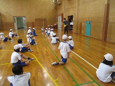 まずは、教室のグループでパスの練習。連続でパスをまわすことがなかなかできません。柔らかいボールの感覚に慣れるまで少し時間がかかるようです。