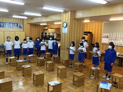 雨の日のうっとうしい気分をはねとばそう!という気持ちで、さわやかに「♪ハローシャイニングブルー」を二部合唱しました。