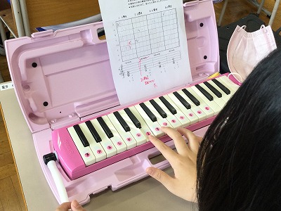 前の時間に、みんなから集めたメロディ作りのプリントを点検しています。和音と離れた音を選んでしまっている人には、アドバイスを残して修正版を練習してもらいました。