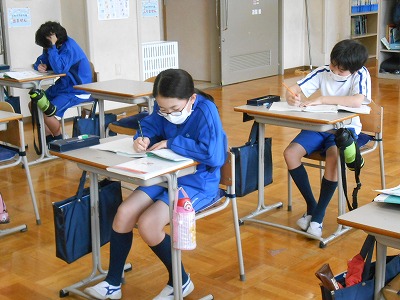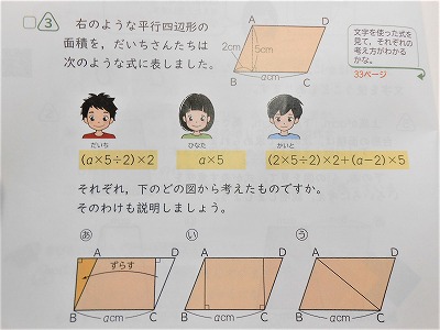 算数は「文字と式」の学習を進めています。今日は、文字の入った式を使って表された式の意味を考えました。