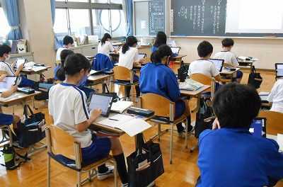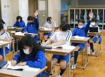 国語は「笑うから楽しい」という説明的文章を使って、「筆者の考え」と「その考えの根拠となる事例」を文中から探す学習を行います。