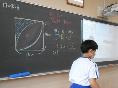 算数は、円の面積について学習しています。今日は、いろいろな形を足したり引いたりしながら、工夫して面積を求める方法について考えます。