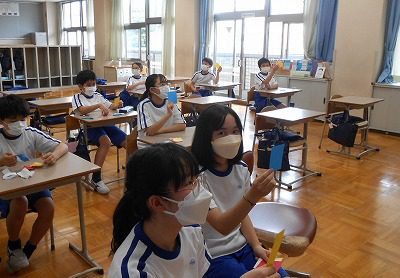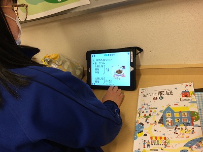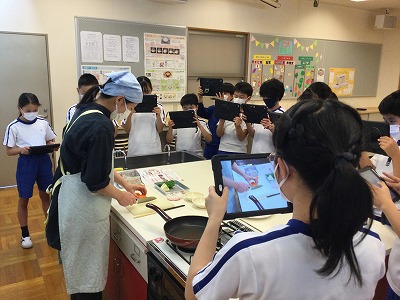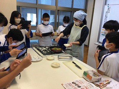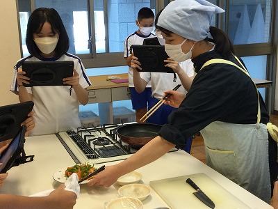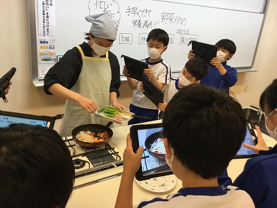 朝の忙しい時間に“手早くおいしく栄養満点”の野菜炒め作りの調理実習を行いました。“エア”の実習ではありますが、野菜を切るときの音やフライパンで油と野菜がはねる音、香ばしい香り、お皿に盛ったときの湯気など、五感をフル稼働させて見学・観察・報告を進めました。