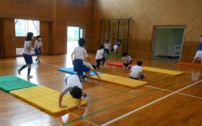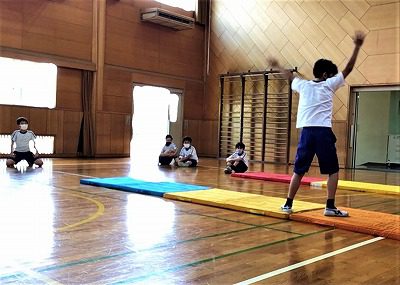 マットの授業では、初めに必ず体慣らしのためのサーキットをしています。2分間のサーキットですが、本気で取り組むと息のあがるコースです。手首などのケガをしないよう、念入りに準備しています。