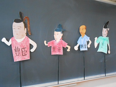 1時間目は昨日に引き続き「学びと力の発表会」の準備を進めました。6年生は、戦国時代について発表を行います。そこで、戦国武将を分かりやすく登場させるための「ペープサート作り」に取り組んでいました。