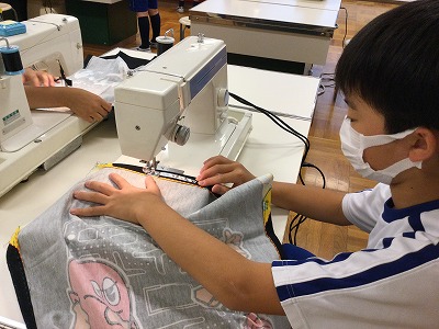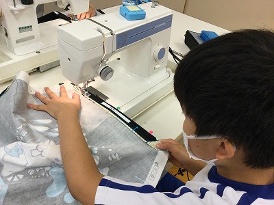ミシン縫いでは、“ひもを通す”ことを前提に、きっとりと“幅”を保って縫っていくことが肝心です。数名、折り目の近くで縫ってしまい、“ひもが通せない”状態になりかけました。“リッパー(糸切り)”登場で、すぐにクリアすることができました。
