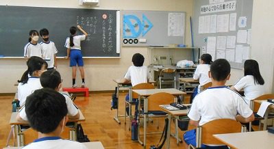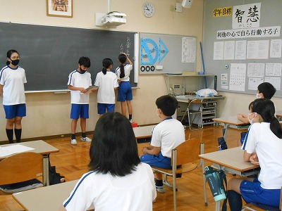 6年生では、「議長」「副議長」「黒板書記」「ノート書記」の4人で議長団のチームを作り、話し合いを進めています。