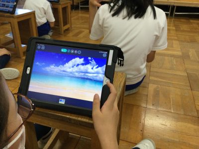 「♪われは海の子」の歌唱に、みんなが選んだ海の画像を映して、歌唱のパワーを盛り上げようと学習しています。