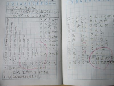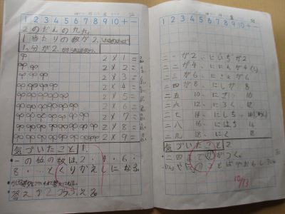 九九の唱え方も漢字・ひらがなで書き、注意するポイントを共通にして練習しています。