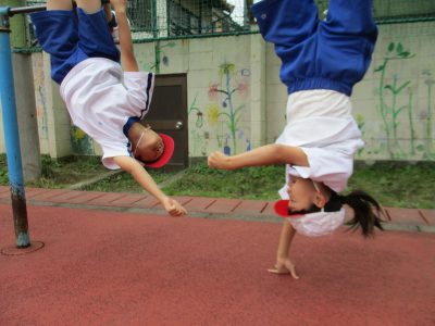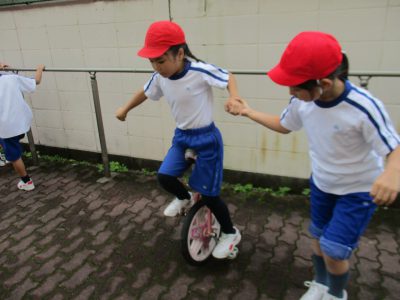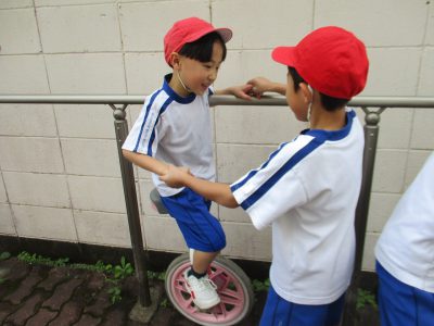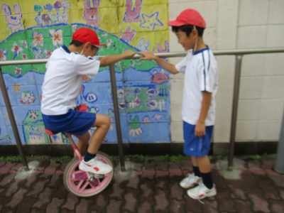 一輪車では、一本増えた手すりを活用し、ペアで練習し合っています。