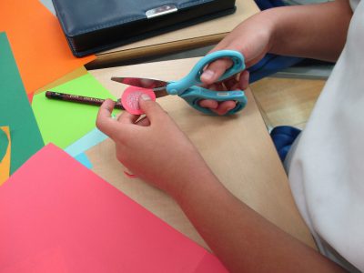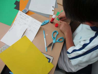 色紙にイメージの形を描き、模様のように切り取って、貼っていきます。