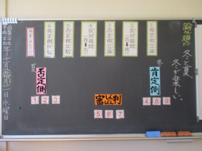 「冬が楽しい」を肯定側に、「夏が楽しい」を否定側に設定し、ディベートゲームのスタートです。