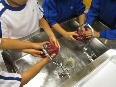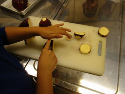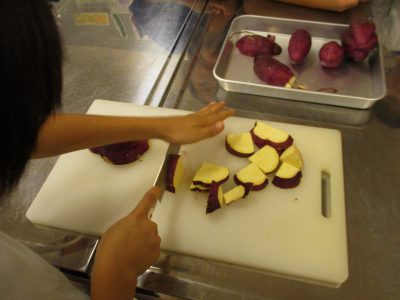 大きいサイズは、先生に安定するように切り分けていただき、押さえ切りで、無事(!?)に焼く準備が完了しました。