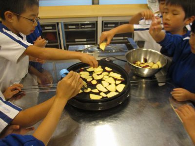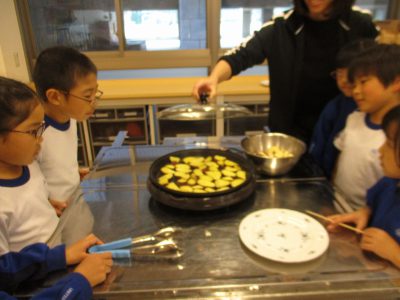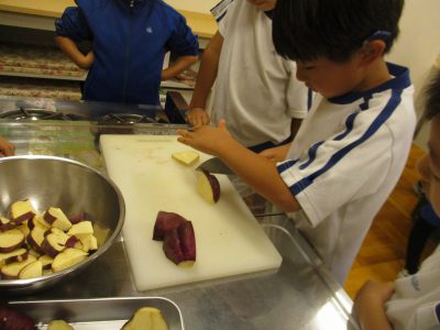 私たちが5校時の学習をしている間に、先生がホットプレートを準備しておいてくださったので、6校時に家庭科室へ行くと、“やきいもパーティー”の支度は万端でした。