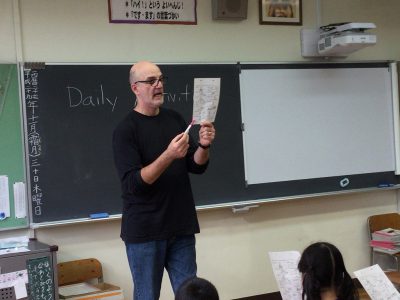 プリントのさし絵や、英文の中の単語をヒントに、何をしている場面かをポール先生に話しています。