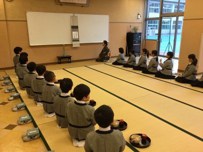まずは、きょうの言葉。「こころはことば」というフレーズを校長先生からいただきました。黄色がかわいい水仙と共に、お床の拝見です。