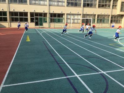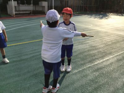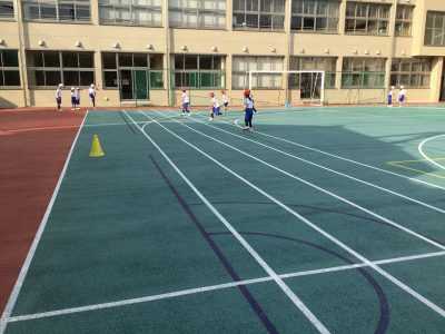 蹴った子は「走れ~!コーンをタッチして戻れば、2点~」